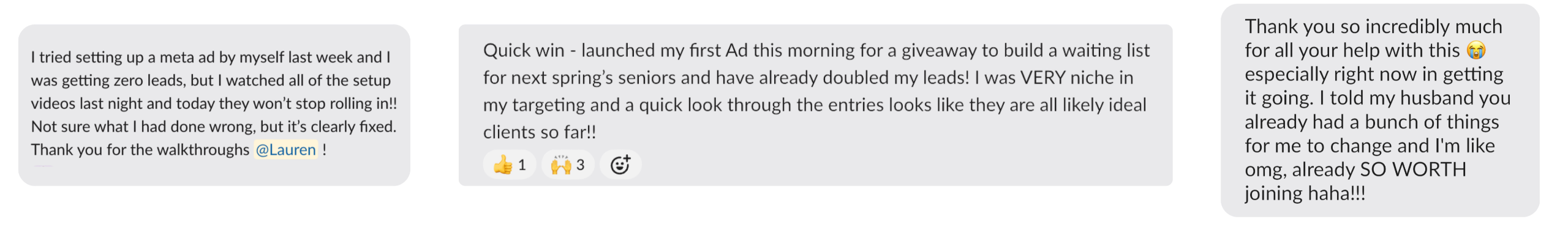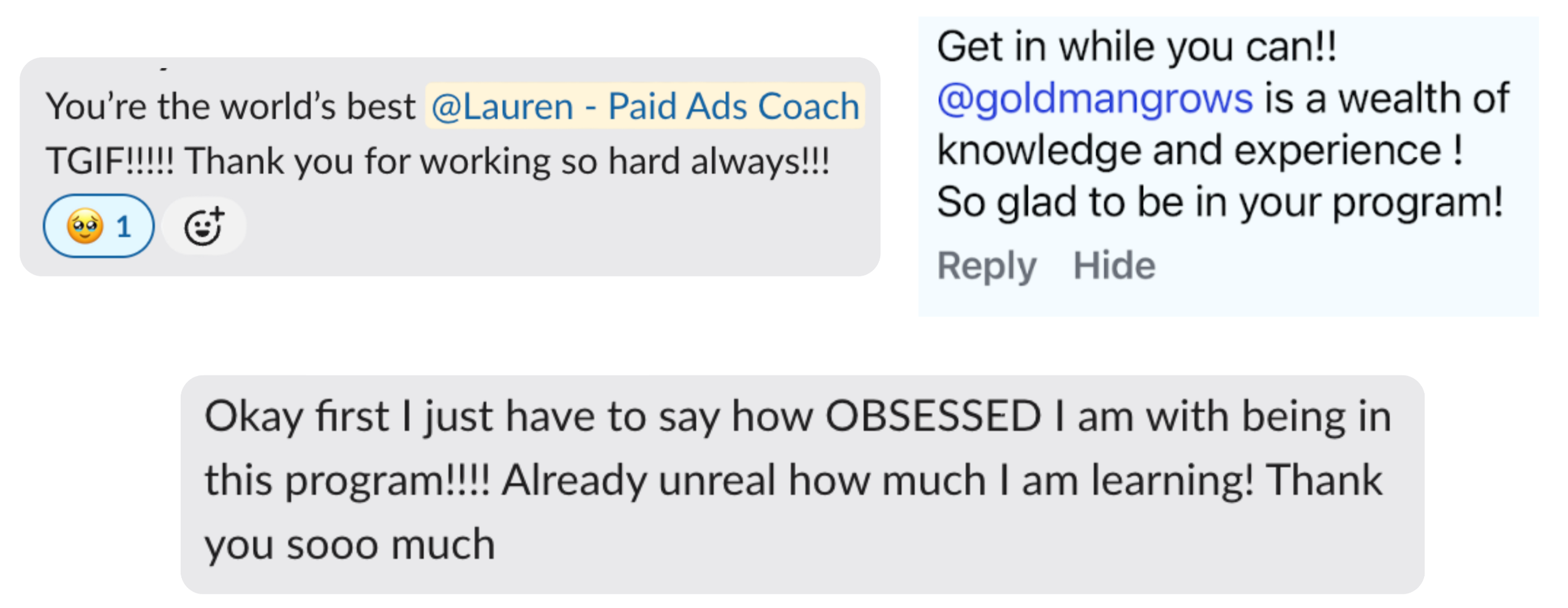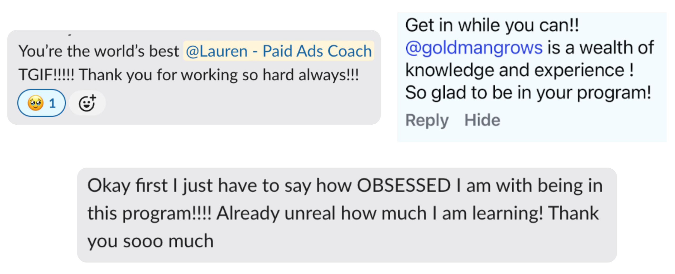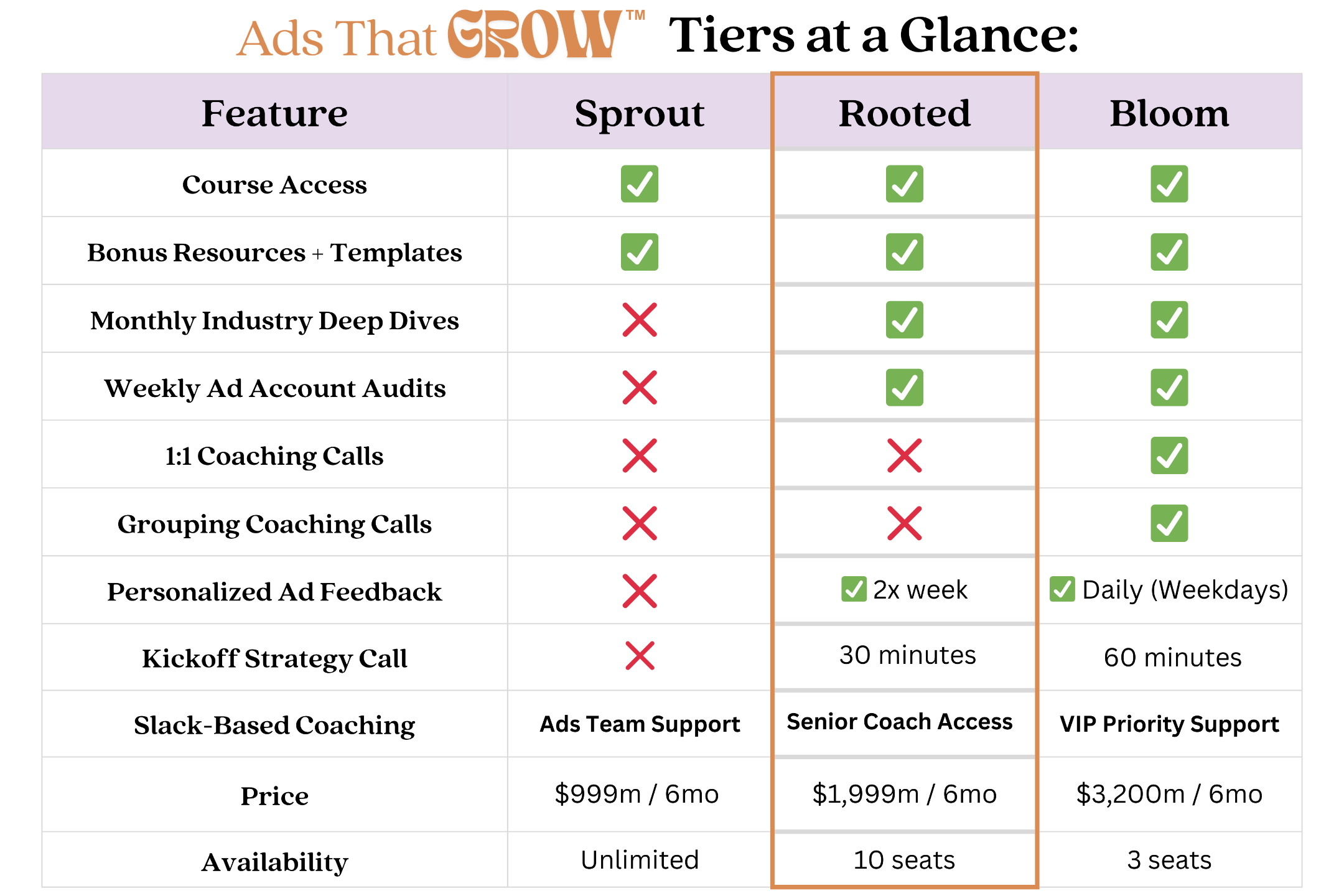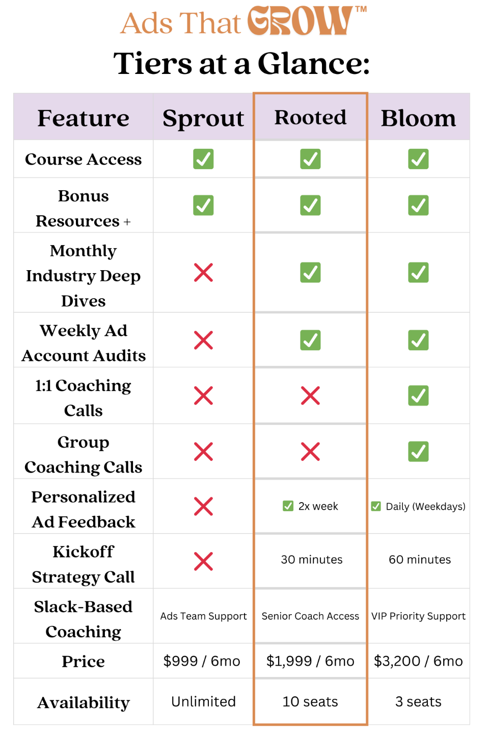 Ads That Grow™ is a high-touch, done-with-you experience. This means we keep each tier intentionally small so every member gets the attention and support they deserve.