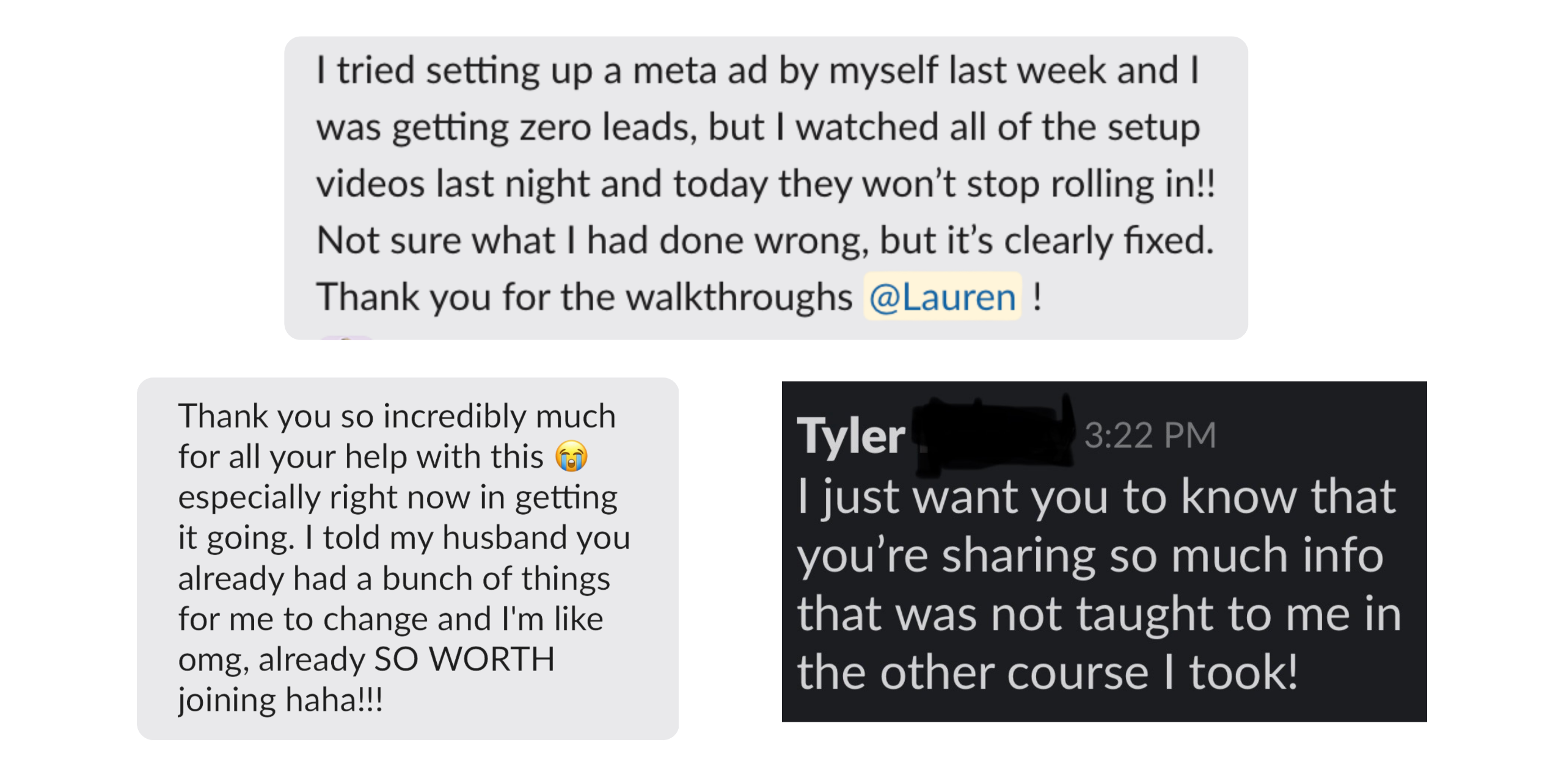 When you work with me and my team, you’re not just learning how to run paid ads. You’re mastering the exact systems and decision-making processes that make ads profitable - no matter the size of your business (or your budget)!